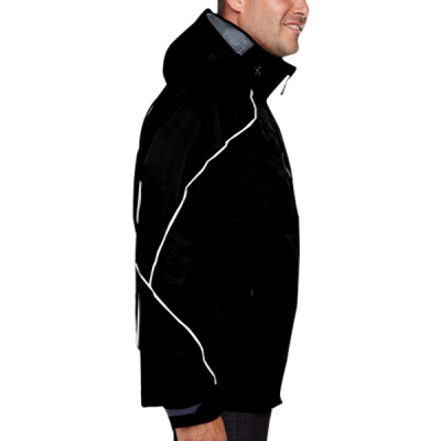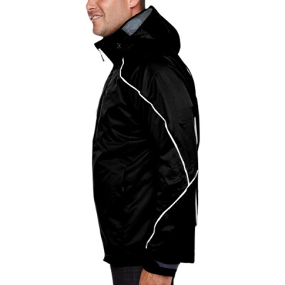 LINER JACKET: 100% polyester jersey ; SHELL: 100% polyester twill, 4.4 oz./yd2/150 gsm; SHELL LINING: 100% polyester taffeta with embossed print; inside storm placket with brushed tricot chin guard and collar; centre front and lower pockets with reverse coil zippers; zip-off hood with back adjustable tab; adjustable cuffs with tabs; chest pocket with invisible zipper; brushed tricot-lined pockets; thermal retention shockcord at hood and drop back hem; contrast stitching along flat reflective piping; audio port access through inside chest pocket; flat reflective piping at front, back and sleeves; audio port access through inside chest pocket; inside placket with brushed tricot-lined collar and pockets;